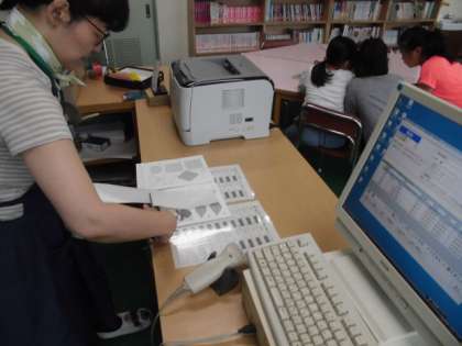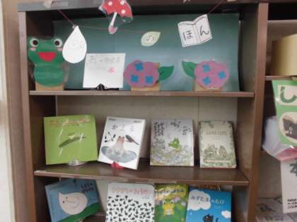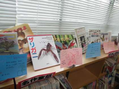 図書館補助員の昌山さんは、先生お薦めの本や各学年の学習に合わせた本、6月にちなんだ本のコーナー展示、本の修理もしていただいたりしています。