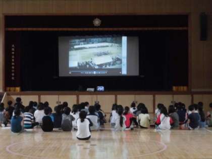 5・6年生が講堂で、運動会の時の団体演技等の動画を視聴し、運動会の振り返りを行っていました。
