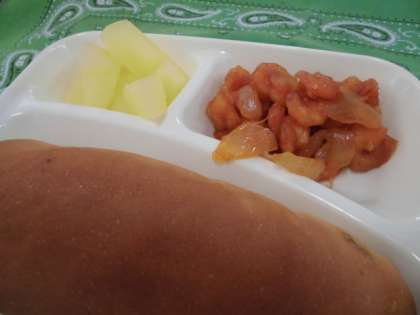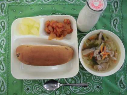 献立は、えびのチリソース、中華スープ、りんご(缶)、パン、牛乳でした。