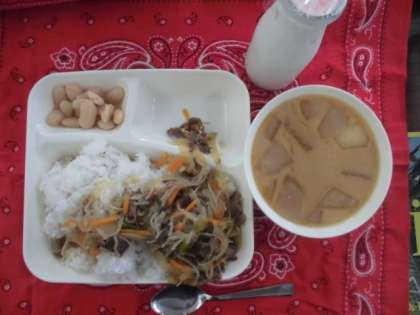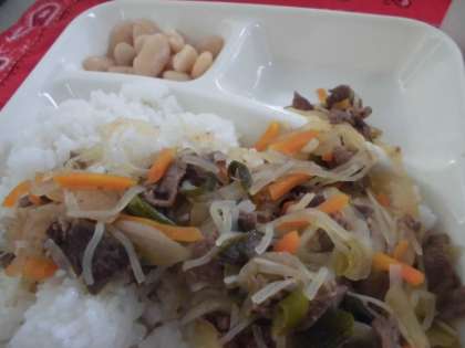 牛丼、とうがんのみそ汁、大福豆の煮もの、牛乳でした。