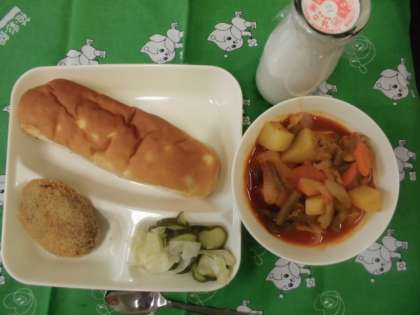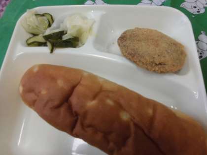 献立は、チキンレバーカツ、ケチャップ煮、キャベツときゅうりのサラダ、おさつパン、牛乳でした。