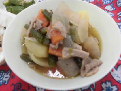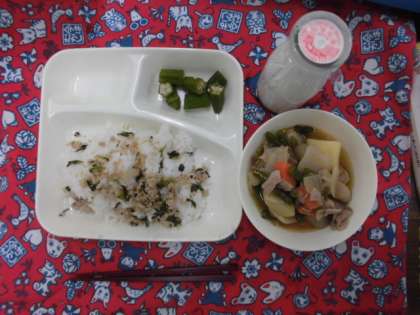 献立は、豚肉とじゃがいもの煮もの、オクラの梅風味、ツナッ葉いため、ごはん、牛乳でした。