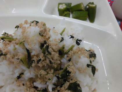 ツナッ葉いための「ツナ」はまぐろの油漬けフレーク、「葉」はだいこんの葉です。これらを味付けしいためたものを、ごはんに添えて(まぶして)いただきました。とてもおいしくてごはんがすすみました。