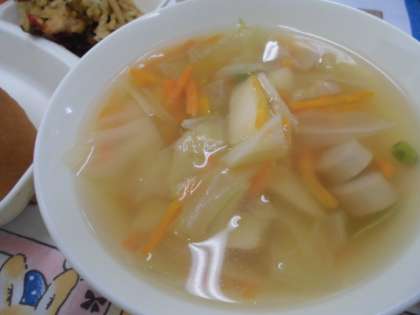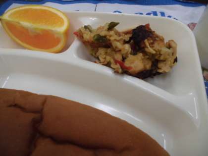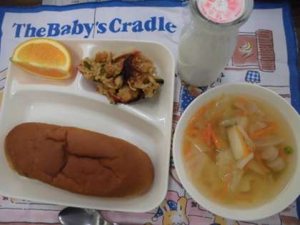 献立は、パエリア、ウインナーとキャベツのスープ、オレンジ、パン、牛乳でした。