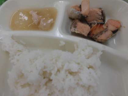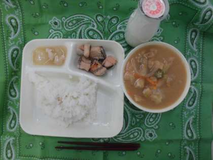 献立は、さけのつけ焼き、みそ汁、とうがんの煮もの、ごはん、牛乳でした。