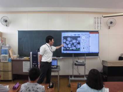 今日は、5年生の出前授業として「日立ハイテクノロジーズ」より 濱 様 他4名の方に来ていただき、最先端技術の一つ電子顕微鏡に関わる授業をしていただきました。
