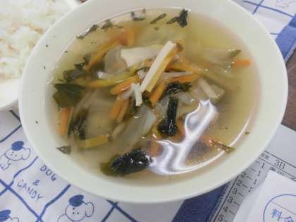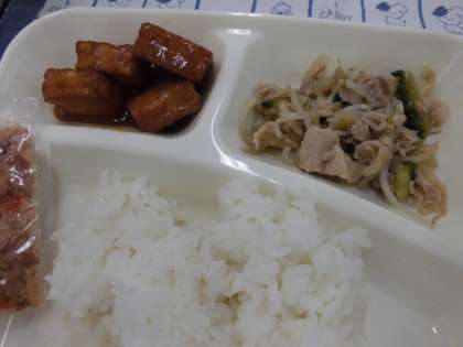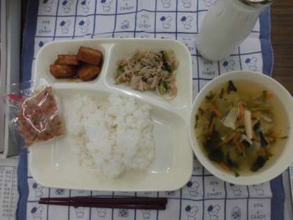 献立は、ゴーヤチャンプルー、すまし汁、あつあげのみそだれかけ、かつおぶし、ごはん、牛乳でした。
