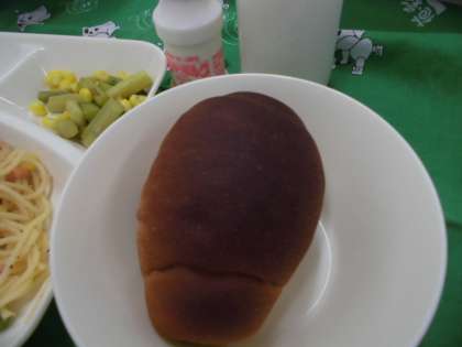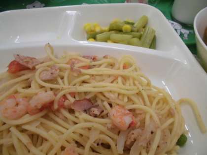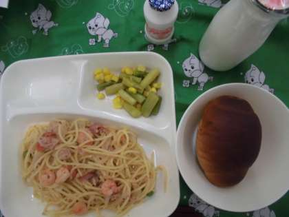 1学期最後の給食の献立は、シーフードトマトスパゲッティ、グリーンアスパラガスとコーンのサラダ、発酵乳、パン、牛乳でした。