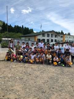 宿舎をバックに集合写真です。風が吹いた時は、涼しさを感じます。