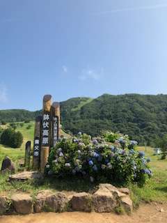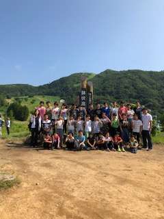 ハチ高原のモニュメント前で、鉢伏山をバックに集合写真を撮りました。