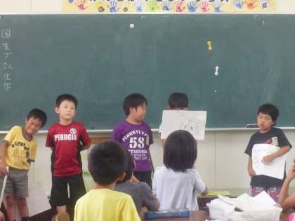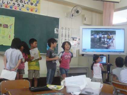 電子黒板や紙芝居、クイズ、実物を触るなどいろいろな方法で発表し、