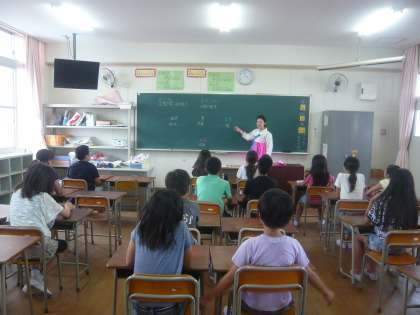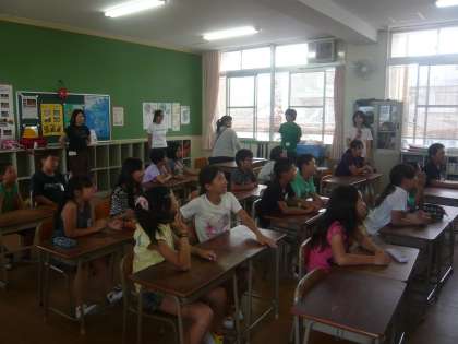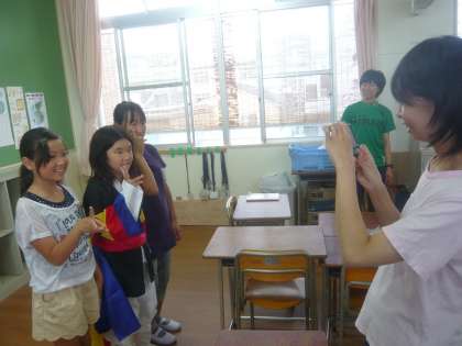 その後、4年生に5・6年生たちが、トゴリ(楽器演奏するときに着用する服)を