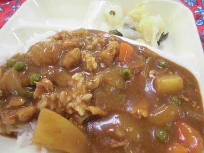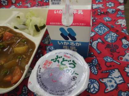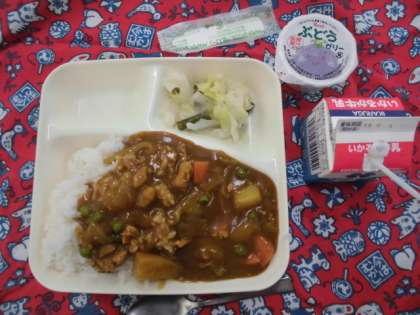 献立は、チキンカレーライス(米粉)、野菜のピクルス、ぶどうゼリー、牛乳でした。