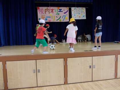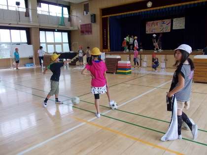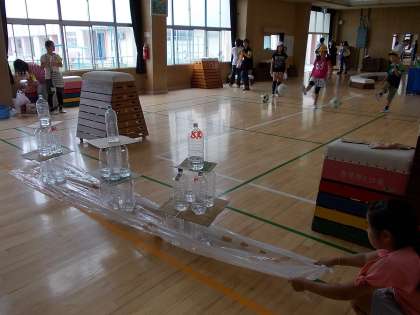 講堂でテレビでおなじみの「キッキングスナイパー」をしました。的を乗せたシートを引っ張って動かしました。うまく当たると大喜びしていました。