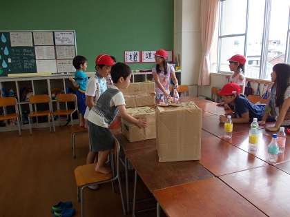5年生は段ボール箱で作った空気砲で的を当てるゲームをしました。空気砲は見た目より威力があり、的に当たって倒れると歓声が起き盛り上がっていました。