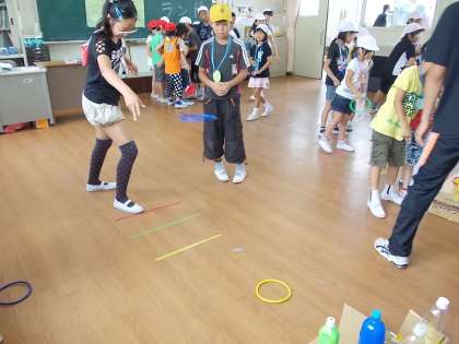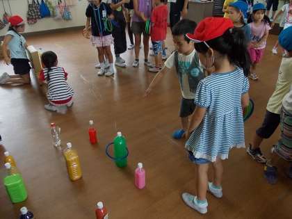 2年生はお馴染みのわなげです。いつどこで何回遊んでも面白いゲームです。うまく入ったときは「やったー」とうれしくなります。小さい子どもから大人まで楽しめました。