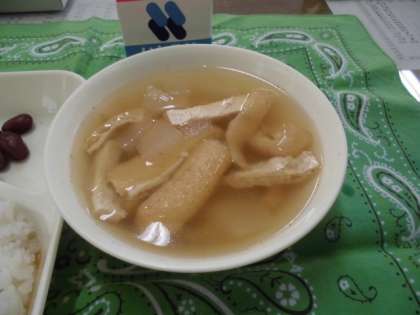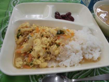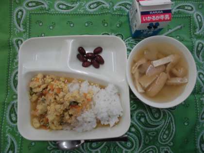 献立は、親子丼、とうがんのすまし汁、金時豆の煮物、牛乳でした。