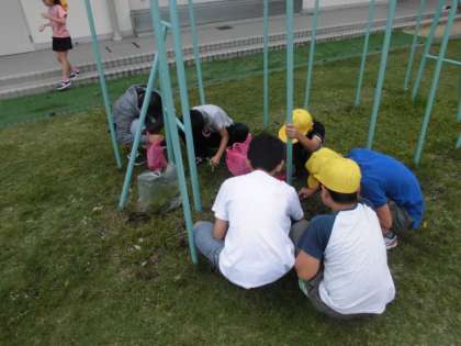 6年生の有志が、芝生を早く気持ちよく使えるようにと、休み時間に芝生のゴミ拾い、雑草除去をしていました。