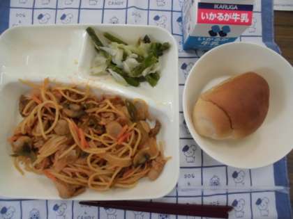 献立は、イタリアンスパゲッティ、グリーンアスパラガスとキャベツのサラダ、パン、牛乳でした。