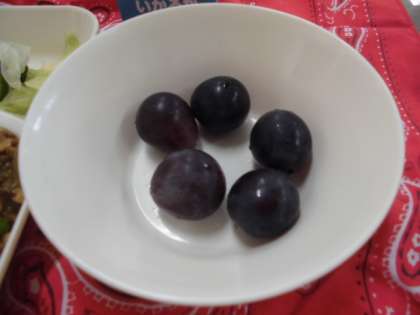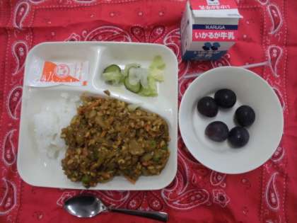 献立は、大豆入りキーマカレー(米粉)、グリーンサラダ(ノンエッグドレッシング)、ぶどう(巨峰)、牛乳でした。