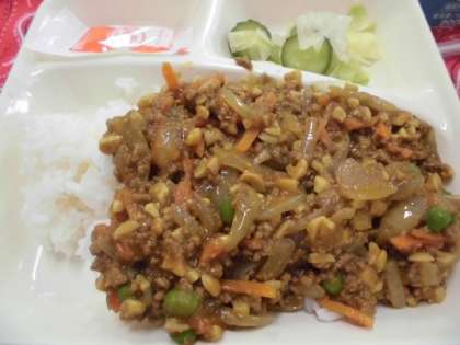 大豆入りキーマカレー、サラダのドレッシングともにアレルギー対応食として調理されています。小麦粉のかわりに米粉、卵をつかっていないマヨネーズ等です。味は、いつもと変わらずとてもおいしくいただきました。