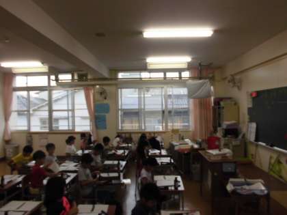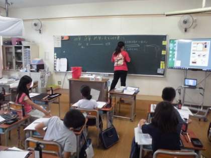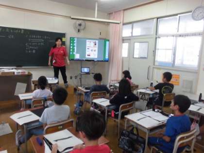 ICT機器(大型モニター)を活用し、書写の指導を展開していました。