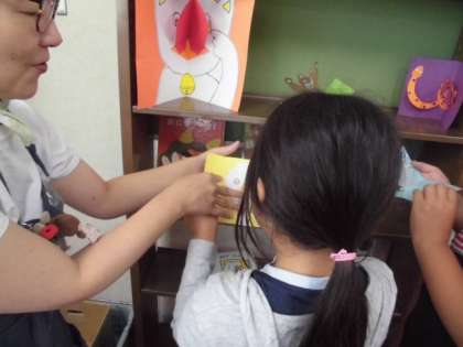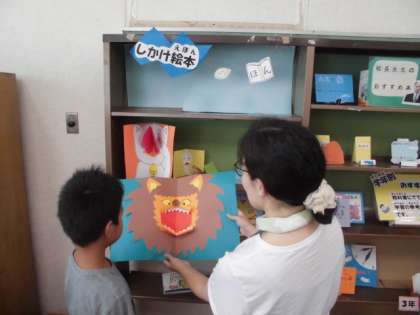 昌山さんが作った仕掛け絵本のいろいろな飛び出すカードをさわって確かめながら楽しんでいる子どもたちです。