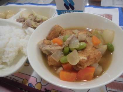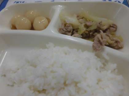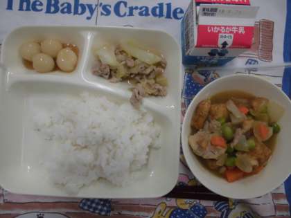 献立は、鶏肉とさといもの煮物、豚肉とキャベツのいためもの、みたらしだんご、ごはん、牛乳でした。