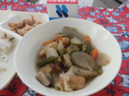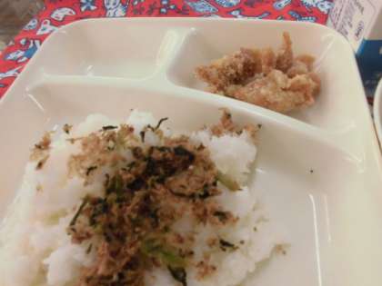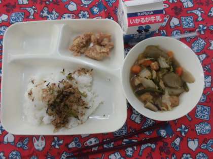 献立は、鶏肉の竜田揚げ、あつあげと野菜の煮物、おかかなっ葉、ごはん、牛乳でした。