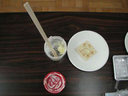 みんなで手作りバターを作り、クラッカーにぬって試食しました。