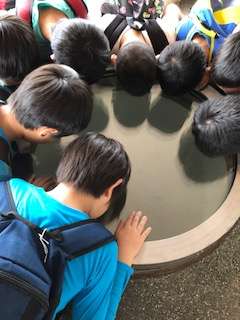 砂ろ過された後の水を見ています。底に大阪市水道局のマークと1997が見えています。