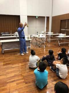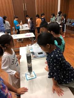 水道のろ過実験の説明を聞いています。