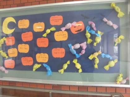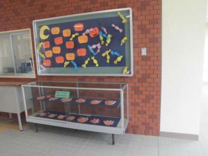 10月にはいっての玄関掲示(月中行事予定表)は、ハロウィンをイメージしたものにかわっています。