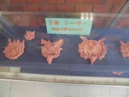 ショーケースには、5年生のシーサーのお面が展示されています。それぞれ個性豊かに表現されています。