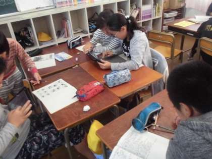 修学旅行のスペイン村での活動計画について、タブレットでスペイン村のことを調べながら各グループごとに話し合っています。