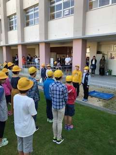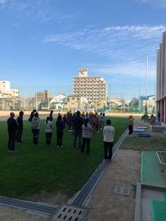 6年生全員がそろって参加の修学旅行。出発式を芝生で行いました。