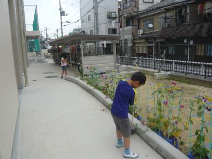 一年生は、教室の他に校長室前廊下、バタフライガーデンへと続く通路を掃除しています。まだまだ、ほうきを使って掃除するのもおぼつかないところがありますが、一所懸命にしています。マットも動かして、見えないところまで掃いています。