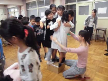 子どもたちが5,6人も段ボール箱に載るとさすがにひしゃげてしまいました。