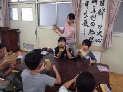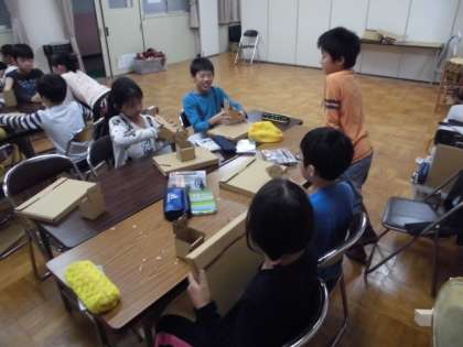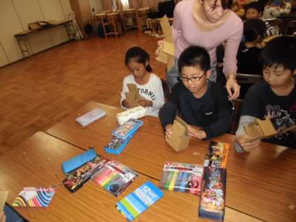 3時間目に続いて、4時間目は段ボール紙を使っての工作をしました。