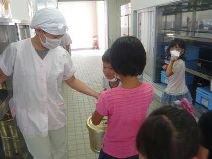 給食室では、給食調理員が子どもたちに直接食缶などを手渡します。