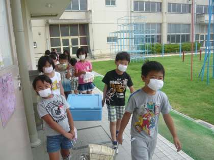 給食当番の子どもたちは、そろって給食室へ向かいます。