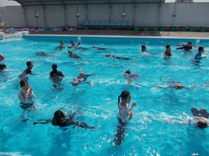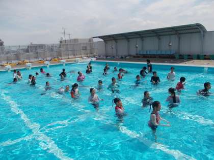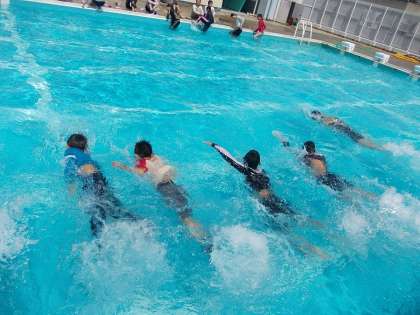 例年実施している「着衣水泳」です。服が水で重くなることを実感しました。