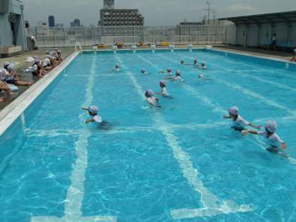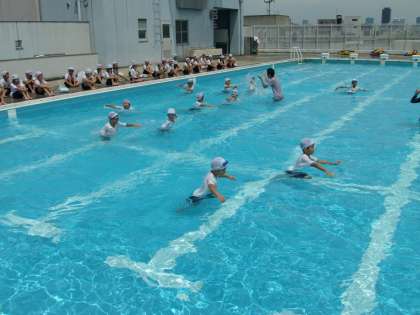 本校では恒例になっている「着衣水泳」を実施しました。これは水の中で服を着ていると重くなり動きにくくなるということを、身をもって体験するためです。1年生は初めて体験したことでしょう。「動きにくい」「重い」という感想が聞かれました。