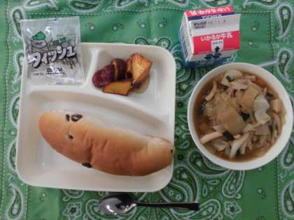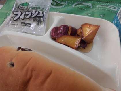 献立は、豚肉といかの中華煮、大学いも、ミニフィッシュ、パン、牛乳でした。