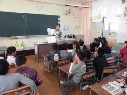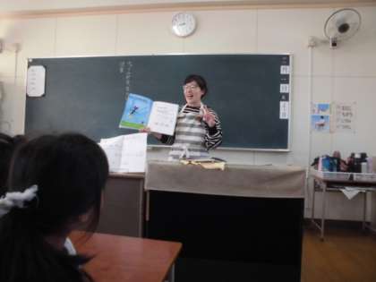 今朝は、2年生に図書館補助員の昌山さんから絵本の読み聞かせをしていただきました。