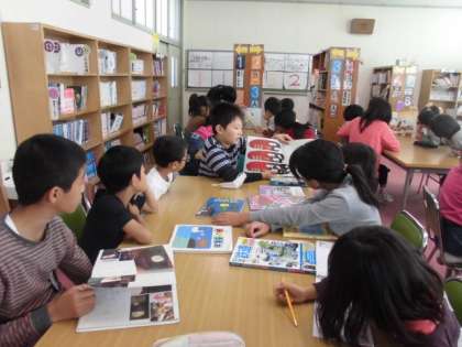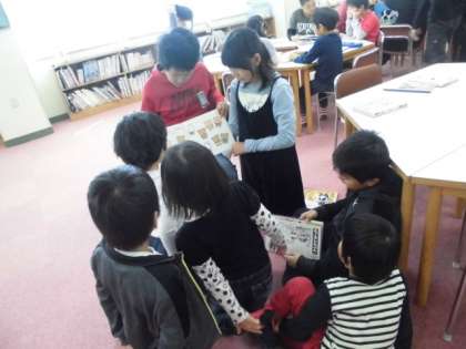 1年生の図書の時間に、6年生が図書館へやってきて、1年生へ本の読み聞かせをしていました。