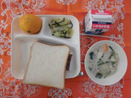 献立は、きのこのクリームシチュー、キャベツのひじきドレッシング、みかん、食パン、ジャム、牛乳でした。