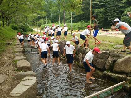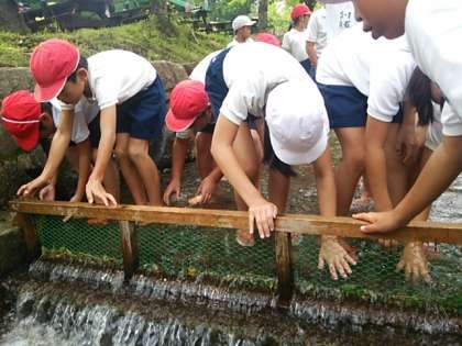 魚つかみです。川の水は冷たく気持ちいいです。そして、自分の手でつかまえた魚は串に刺し、塩をつけてすぐに焼いて食べます。新鮮さ抜群です。
