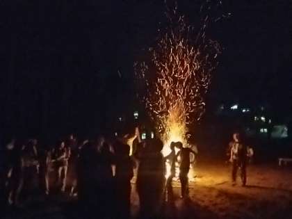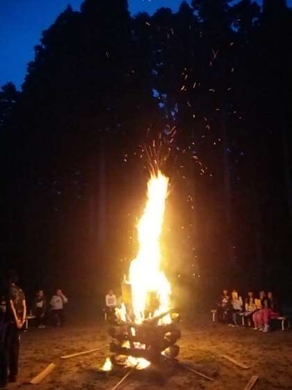 夜のメインイベント、キャンプファイヤーです。大いに盛り上がりました。各班のスタンツ(出し物)も盛り上がり、時間制限がかかるほどでした。
