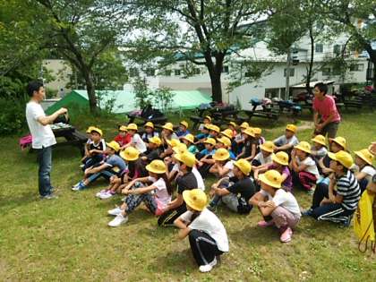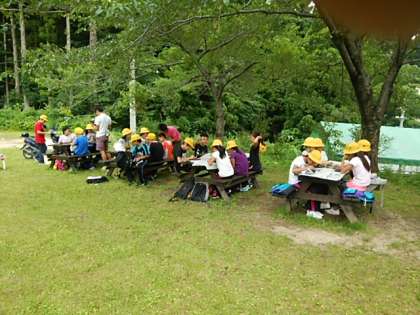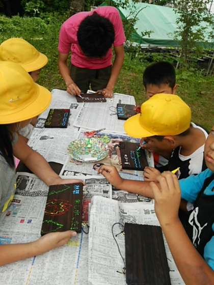 焼き板工作です。焼けている杉板を磨いて、林間学舎の思い出を文字や絵で表現します。世界でたった一つの手作りの思い出です。将来、いつでも思い出がよみがえります。